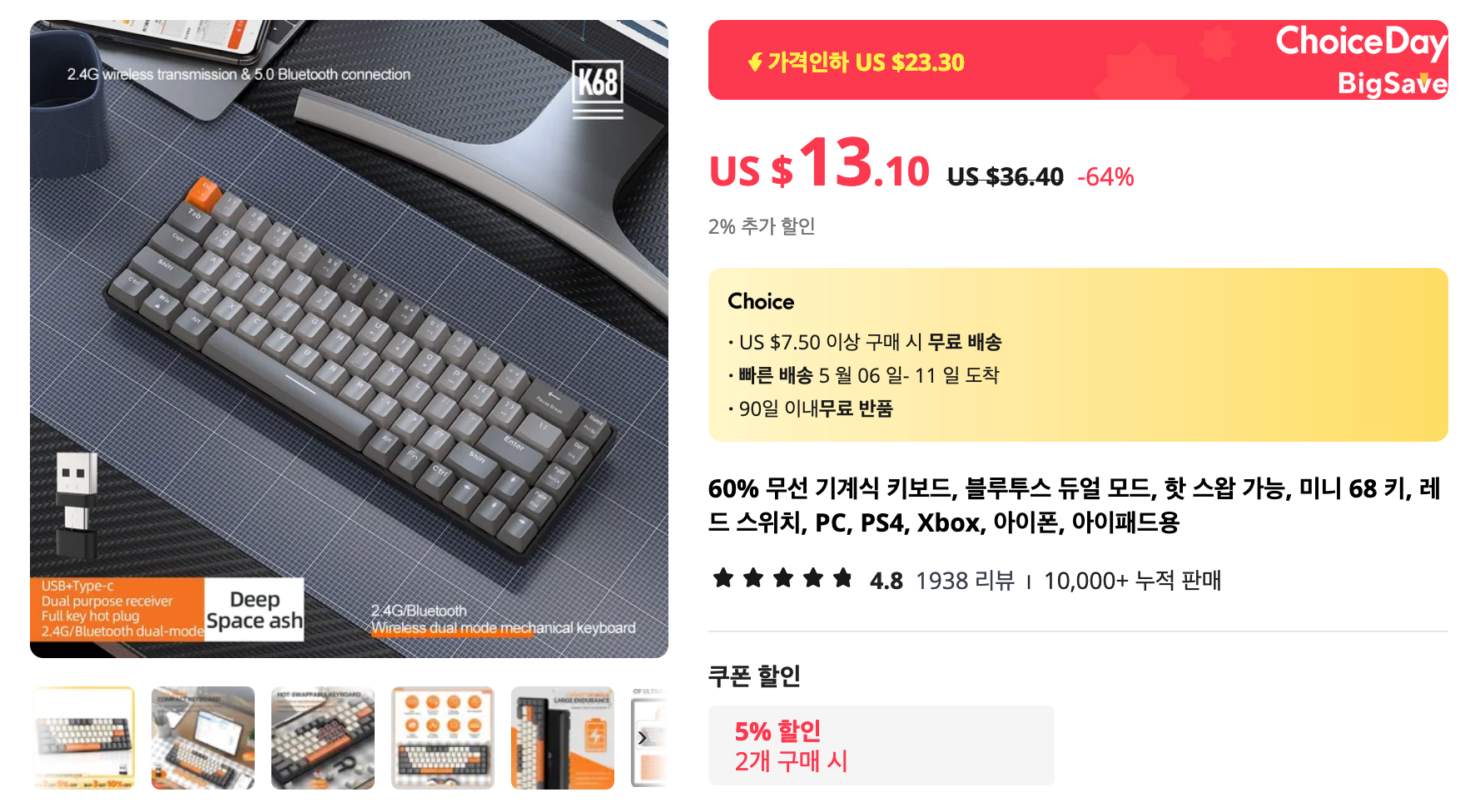 기계식 키보드 입니다. 68키 미니 배열로 서브 키보드 또는 휴대용으로 쓰기 좋다고 하네요. 펑션키를 자주 사용하시는 분들에게는 적합하지 않지만 (FN키를 같이 눌러야 하는 배열임으로) 가격이 착해서 재미삼아 기계식 키보드 또는 68키 배열에 입문하고 싶으신 분들에게 추천합니다.
