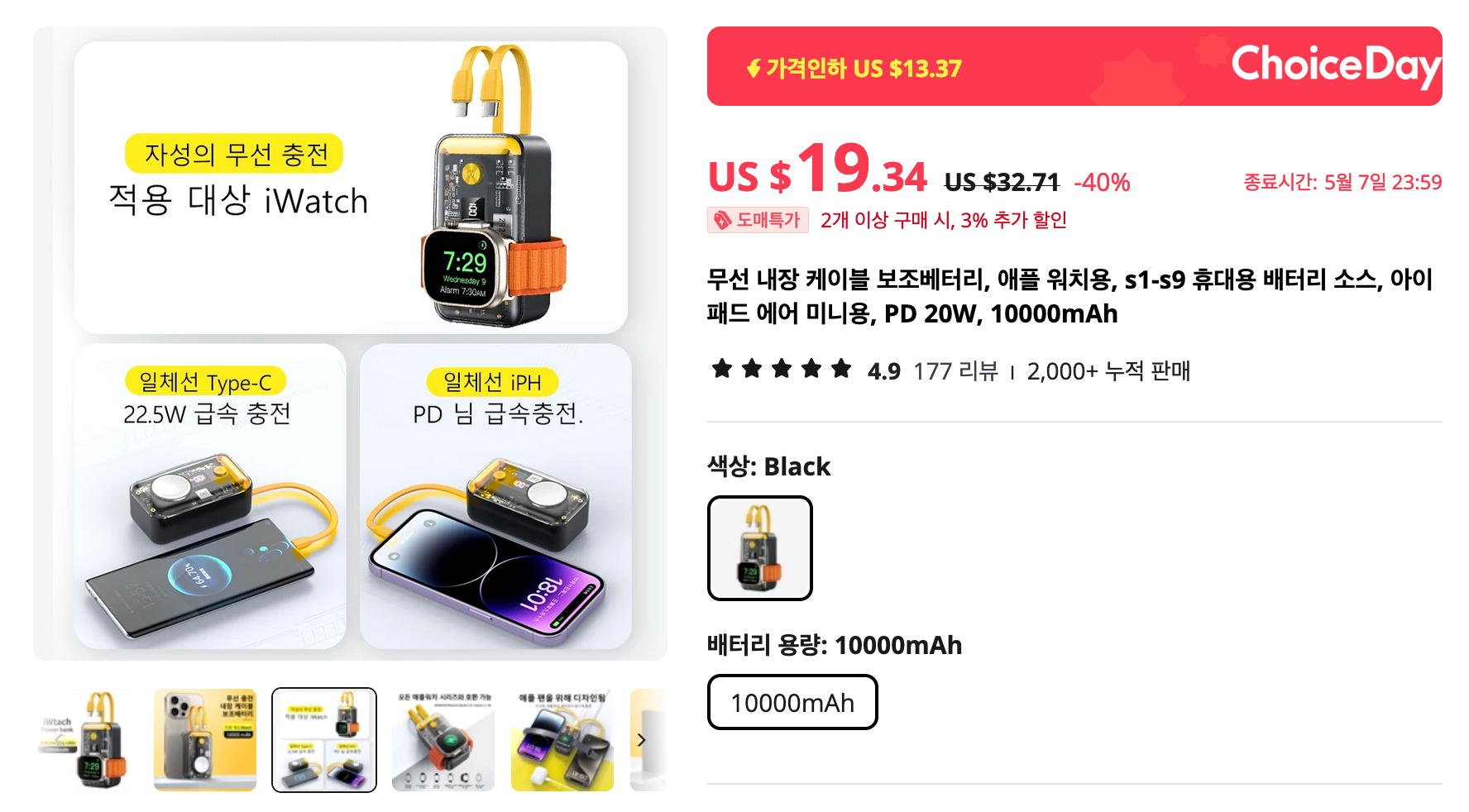 애플워치까지 충전할 수 있는 보조배터리 입니다. USB-C 케이블과 라이트닝 케이블이 내장되어 있어서 너무 좋은 제품이죠.