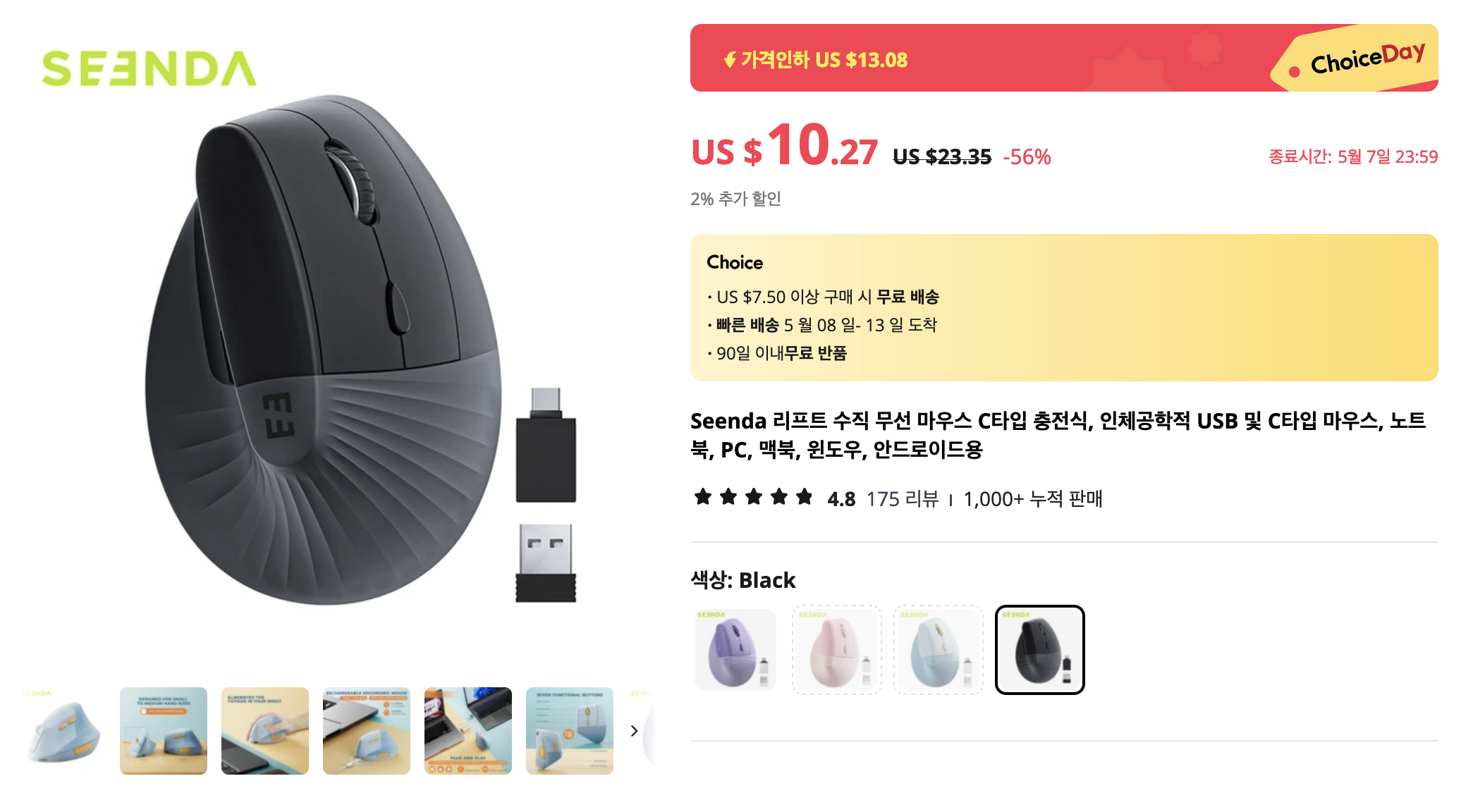 사용하기 편한 버티컬 마우스 Seenda Lift입니다. 로지텍 리프트와 비교할 수는 없겠지만, 그래도 가성비가 매우 좋다고 하네요.