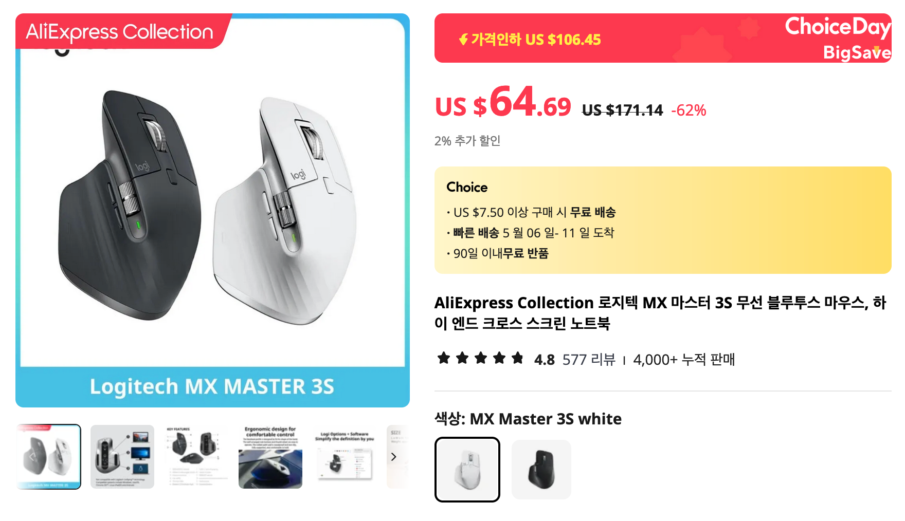 사무용 마우스의 끝판용으로 불리우는 로지텍MX Master 3s입니다. 저번에 쎄일할 때 못샀는데 다시 할인하고 있네요. ㅎㅎ