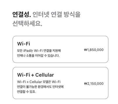 와이파이 전용 모델이냐, 셀룰러 모델이냐를 선택할 수 있는데요. 여기서도 셀룰러 모델을 선택하면 30만원을 추가 해야 합니다. 2024년 아이패드 부터 물리유심칩이 아닌 eSIM(이심)으로 전환되었다고 하니 역시 이 점도 알고 구입하시구요.