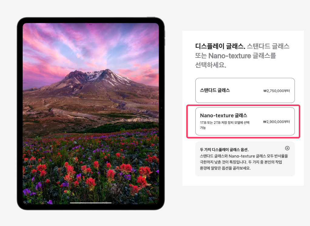 이렇게 디스플레이 글래스를 나노 텍스처 글래스로 업그레이드 할 수 있습니다. 275만원에서 290만원으로 올라가는 거니까 15만원 추가를 하면 디스플레이 글래스를 업그레이드할 수 있다고 보시면 되겠네요. 참고로 이 디스플레이 글래스 옵션을 선택할 경우 애플의 극세사 광택용 천이 기본 구성품으로 제공된다고 하니 참고하세요.