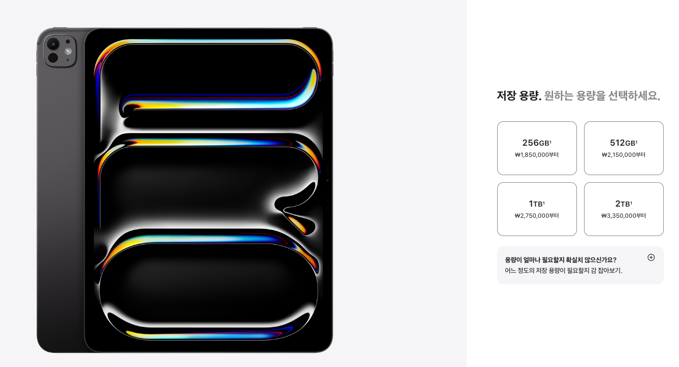 자 그럼 13인치 모델을 계속 쇼핑해보겠습니다. 아이패드 프로의 경우 11인치 보다는 13인치 모델을 찾는 분들이 더 많고, 또 이게 주력 모델이기도 해서 그렇죠. 1TB 모델을 선택하면 스펙상 더 업그레이드된 모델이기도 하구요.