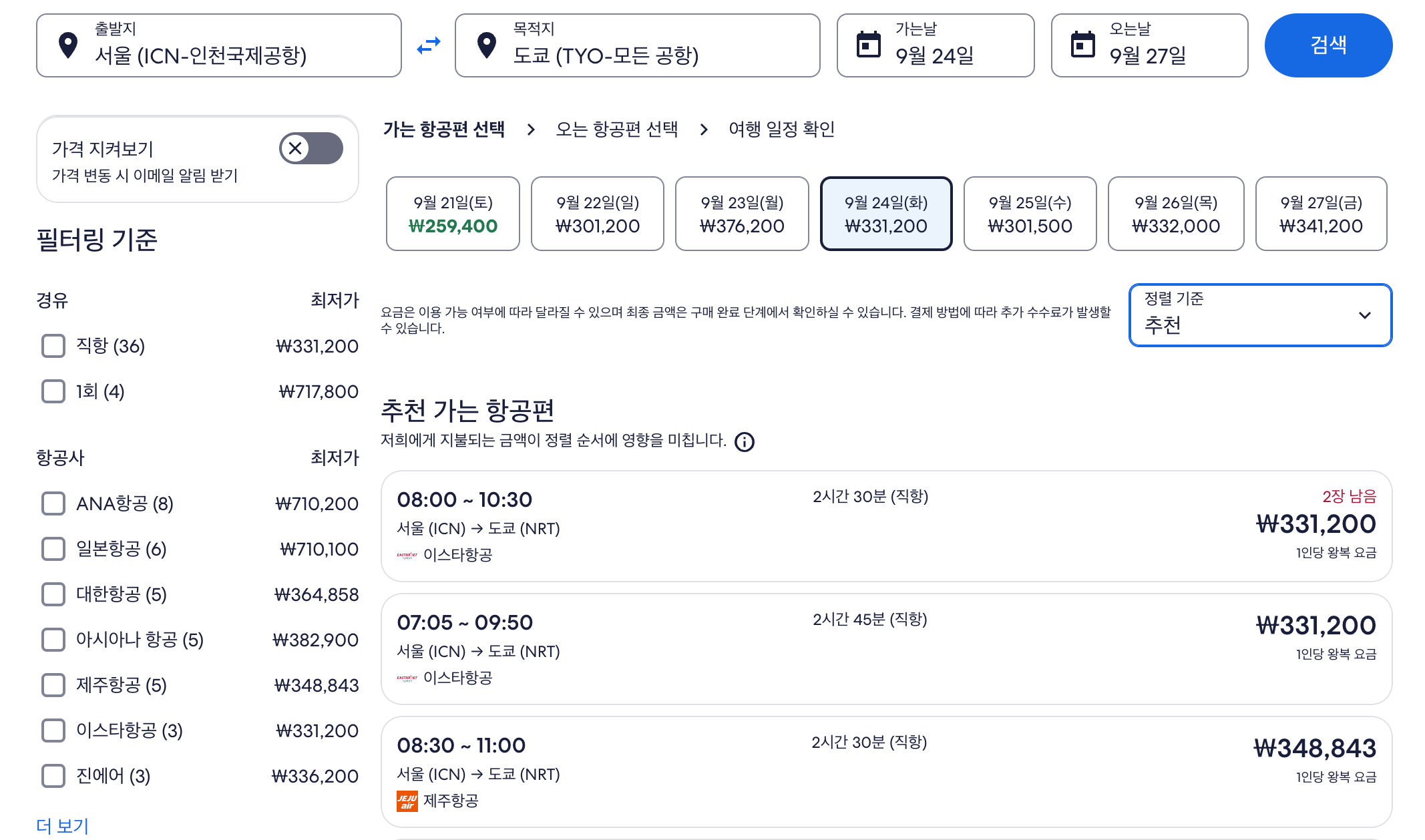 그러면 위와 같이 가장 저렴한 항공사들의 가격 조건이 나오네요. 쉽게 비교해볼 수 있어서 좋습니다.