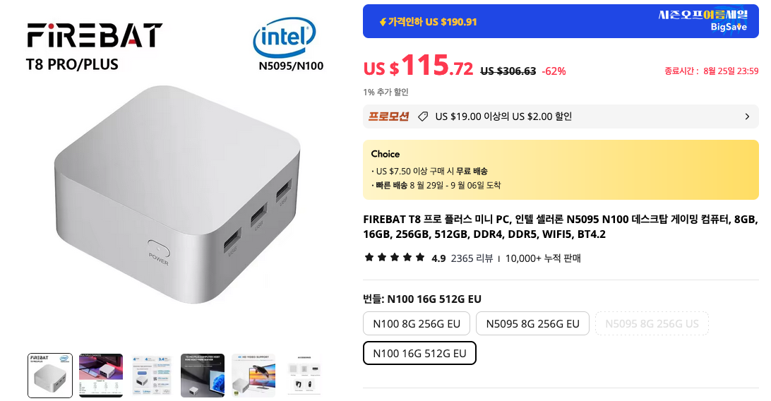 가성비 좋기로 유명한 파이어뱃 T8 미니PC 입니다. N5095보다는 N100 모델이 성능이 좋으니 그걸 추천합니다. 또한 이 제품은 윈도우가 깔려오긴 하지만, 가급적 초기화 (또는 포맷하고 클린 인스톨)하고 사용하시길 권장합니다.