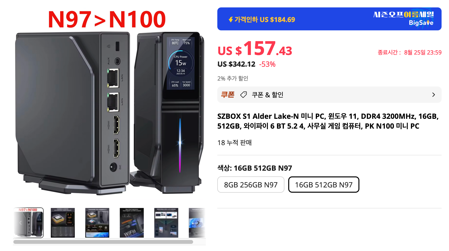 사무용, 업무용으로 쓸 수 있는 오피스용 미니PC는 N100 제품이 주류를 이루었는데요. 이건 인텔 N97 입니다. 칩의 넘버링 숫자는 더 적어졌지만 오히려 인텔 N100보다 더 높은 성능을 가진 업그레이드 모델입니다. 가격도 착하네요. 이제 데탑 컴퓨터를 살 이유가 없어졌습니다. ㅎㅎ