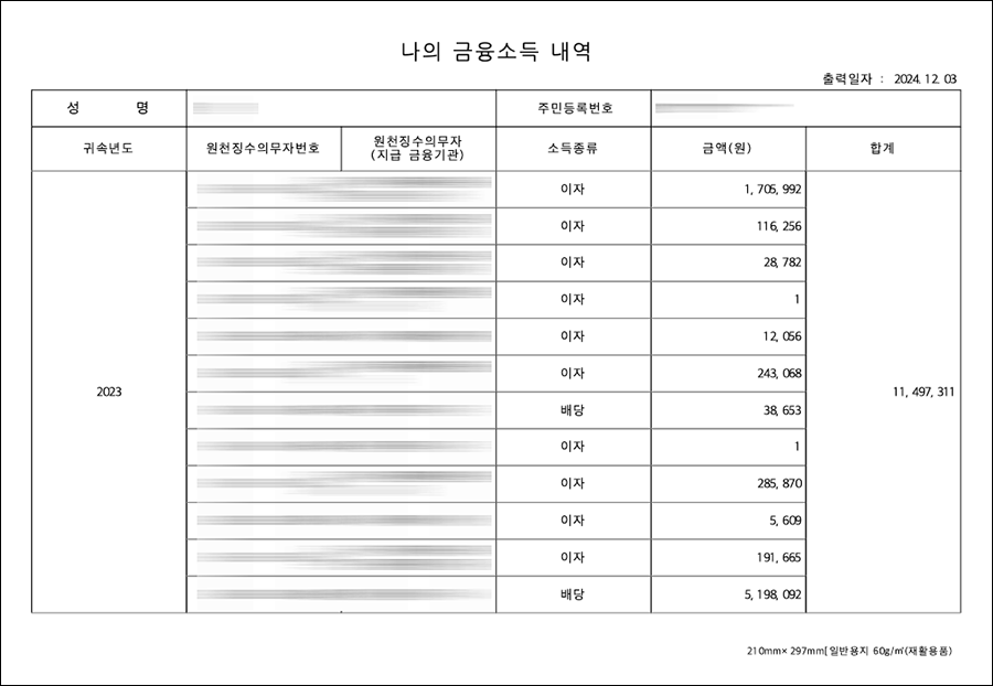 건강보험공단에서 제공하는 직전년도의 금융소득을 뽑아볼 수 있습니다.