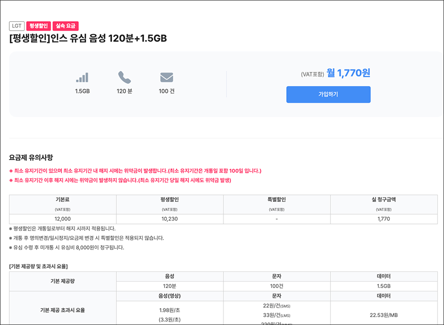 테스트 용도로 산 것이라 요금제는 평생할인 인스 유심 음성 120분 + 1.5GB로 했는데, 기본 제공 데이터를 모두 소진하면 별도의 요금이 있는 것 같아서 와이파이 환경에서만 잘 사용해야 겠네요.