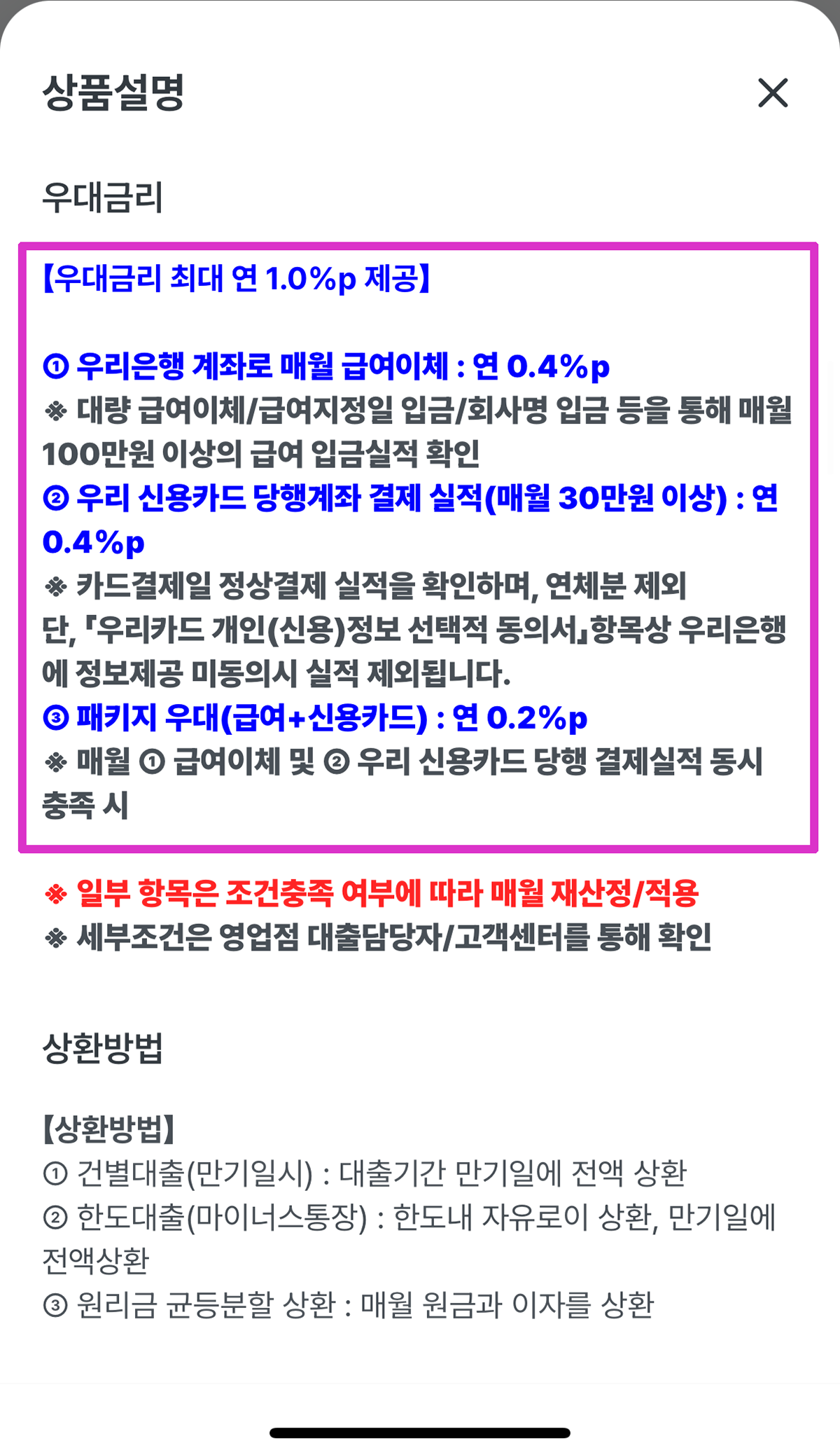우대금리 조건이 너무 복잡했다. 급여이체나 신용카드 실적 등등이 있어서... 대부분의 은행은 중도상환해약금 조건도 있기 때문에... 일단 우리은행에서 빌리는 것 보다는 카카오뱅크가 더 유리하지 않나 생각을 해보게 된다.