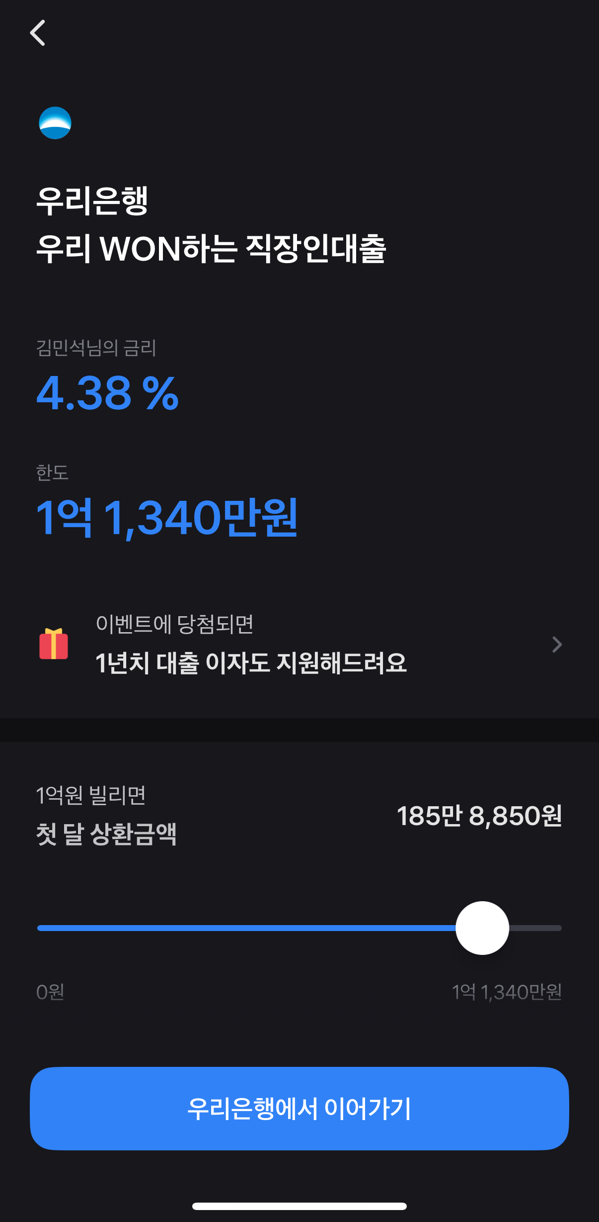 신용대출 상품을 비교해보니... 가장 매력적인 대출을 해주는 은행은 우리은행이었다. 최대 1억 1340만원까지 4.38% 금리로 대출을 해준다고 한다. 그래서 우리은행으로 이동해서 보니...