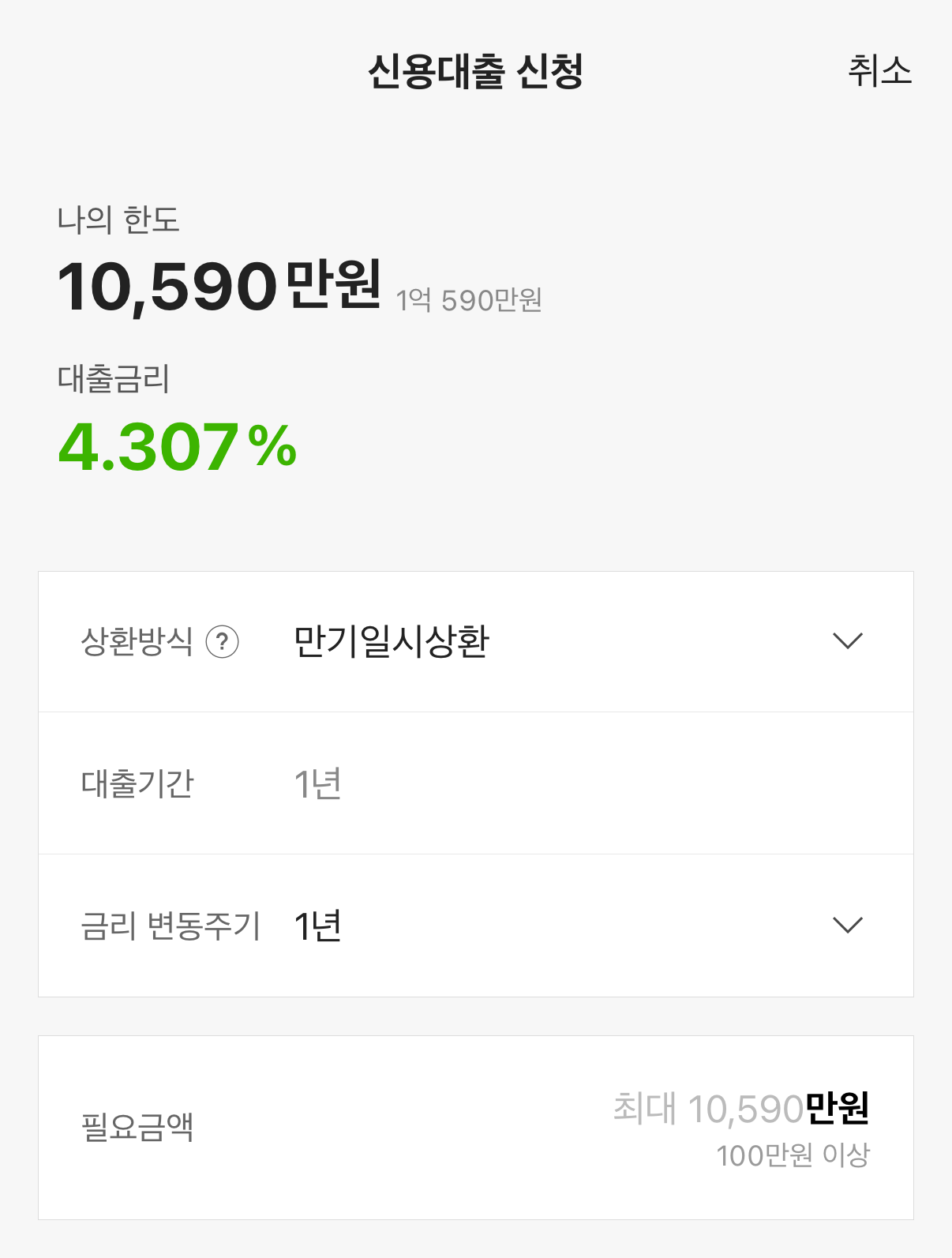3년으로, 금리 변동주기 1년으로 하니 4.376%, 한도는 10590만원이 되었다.