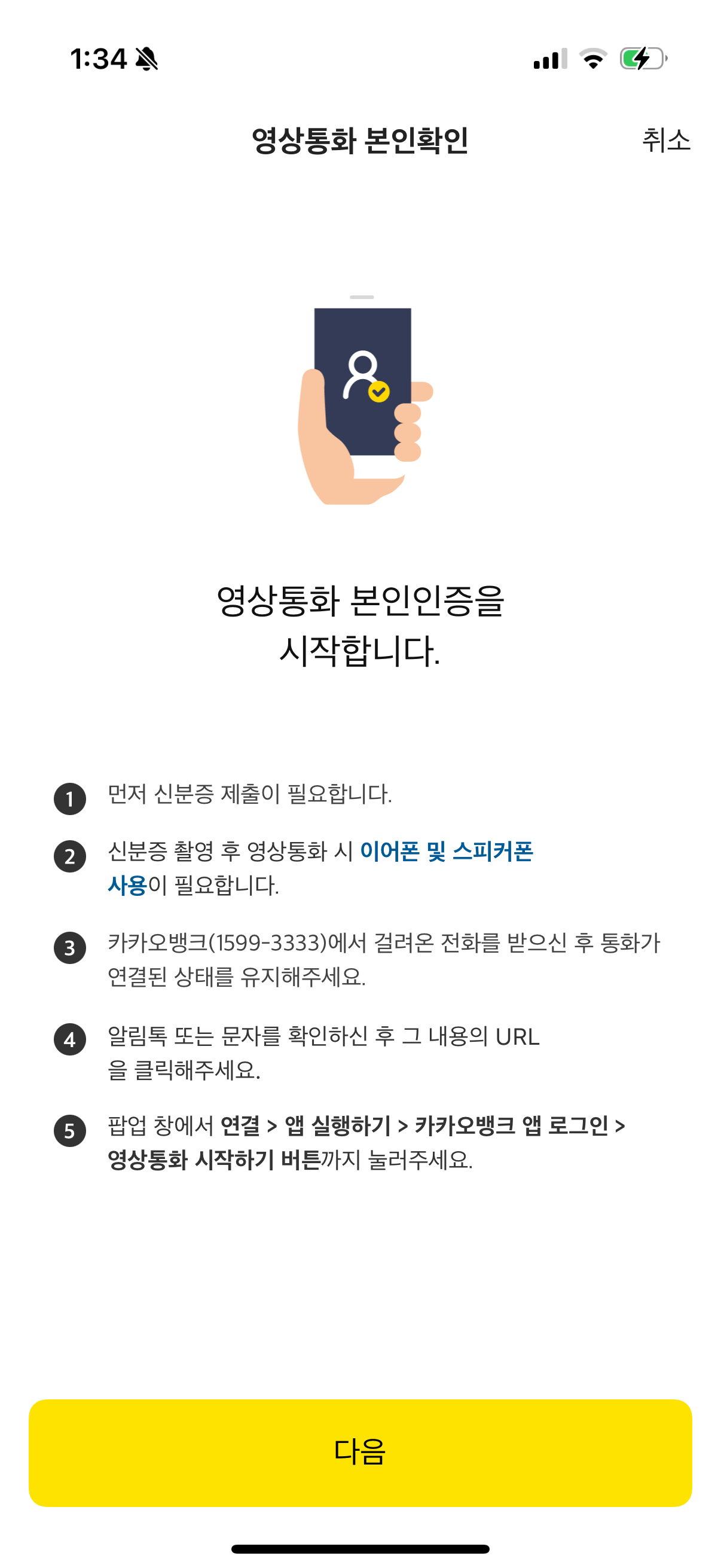 신분증을 인증하고, 영상통화를 해야 한다고 하네요. 저는 아이폰을 사용하는데 어떻게 영상통화가 될지 궁금해지기도 했습니다. 페이스타임으로 하는 것은 아닌것 같고... ㅎㅎ 아무튼 운전면허증으로 인증을 하고 기다리니 정말 카뱅 고객센터에서 전화가 오더군요.