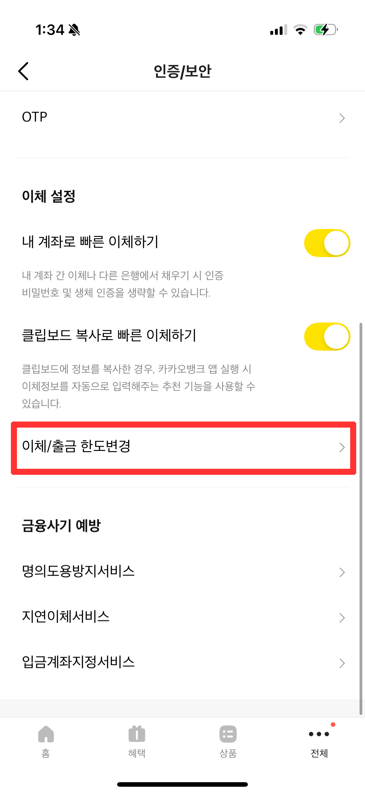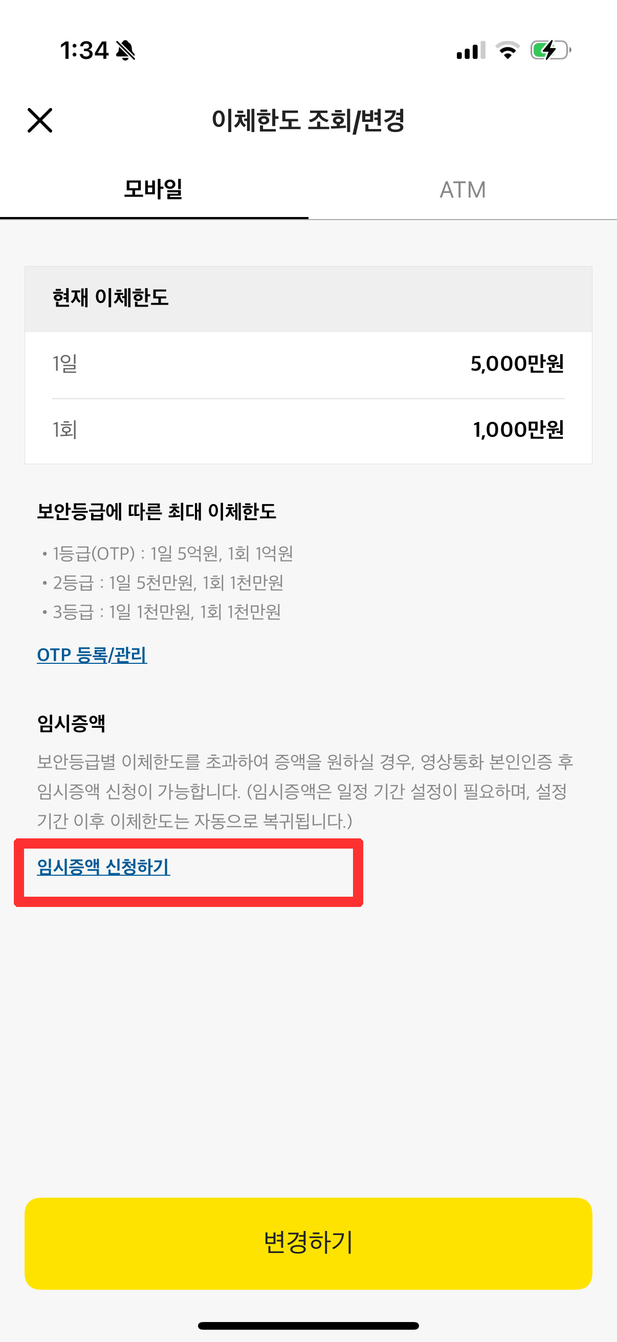 드디어 1억 이라는 돈을 움직일 때가 오더군요. 그래서 잘 알아보니 카뱅에는 별도의 OTP이 없이 고액으로 하는 방법 대신, 임시로 한도를 올릴 수 있는 방법이 있다고 해서 알아보게 되었습니다.