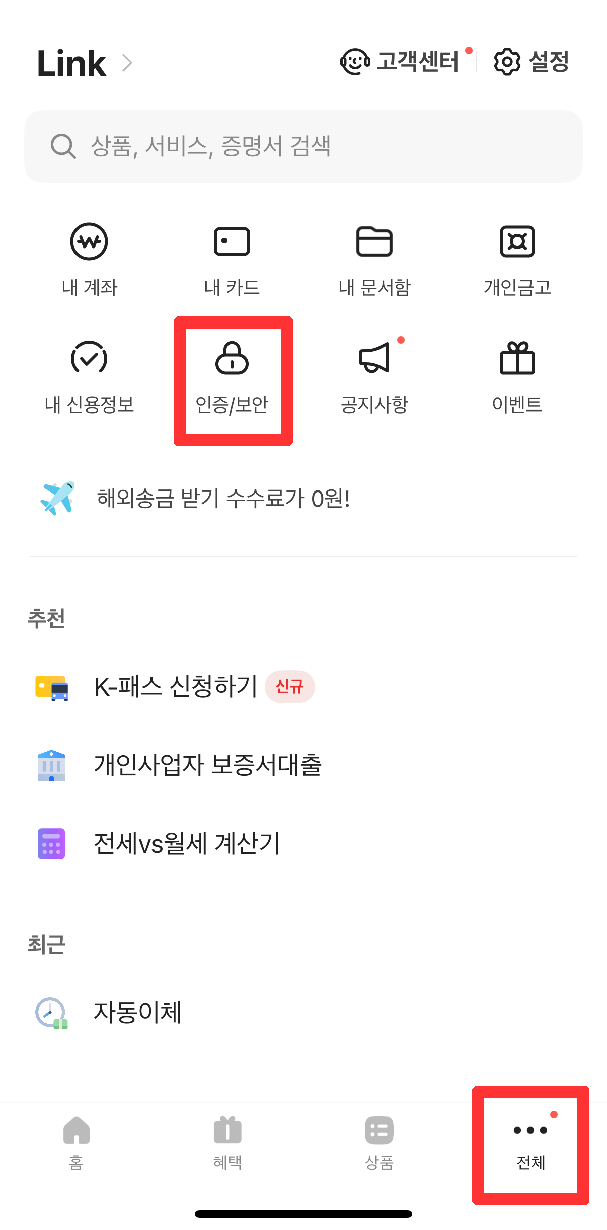 먼저 해당 기능을 신청하기 위해서는 전체 > 인증/보안 > 이체/출금한동변경으로 찾아 들어갑니다. 그러면 임시증액 신청하기가 보이죠?