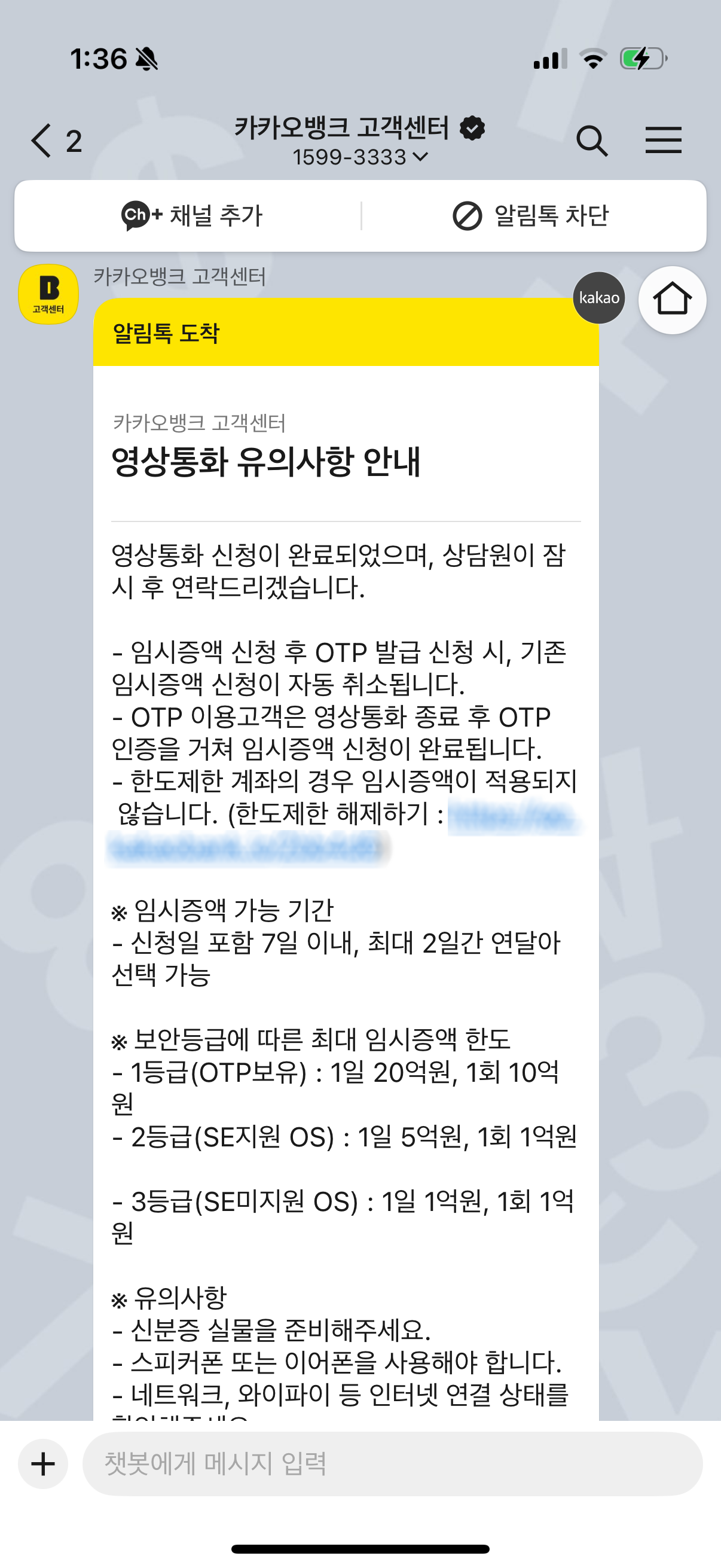 카카오뱅크 이체한도 임시증액 신청하기 (직원 영상 통화 필요)