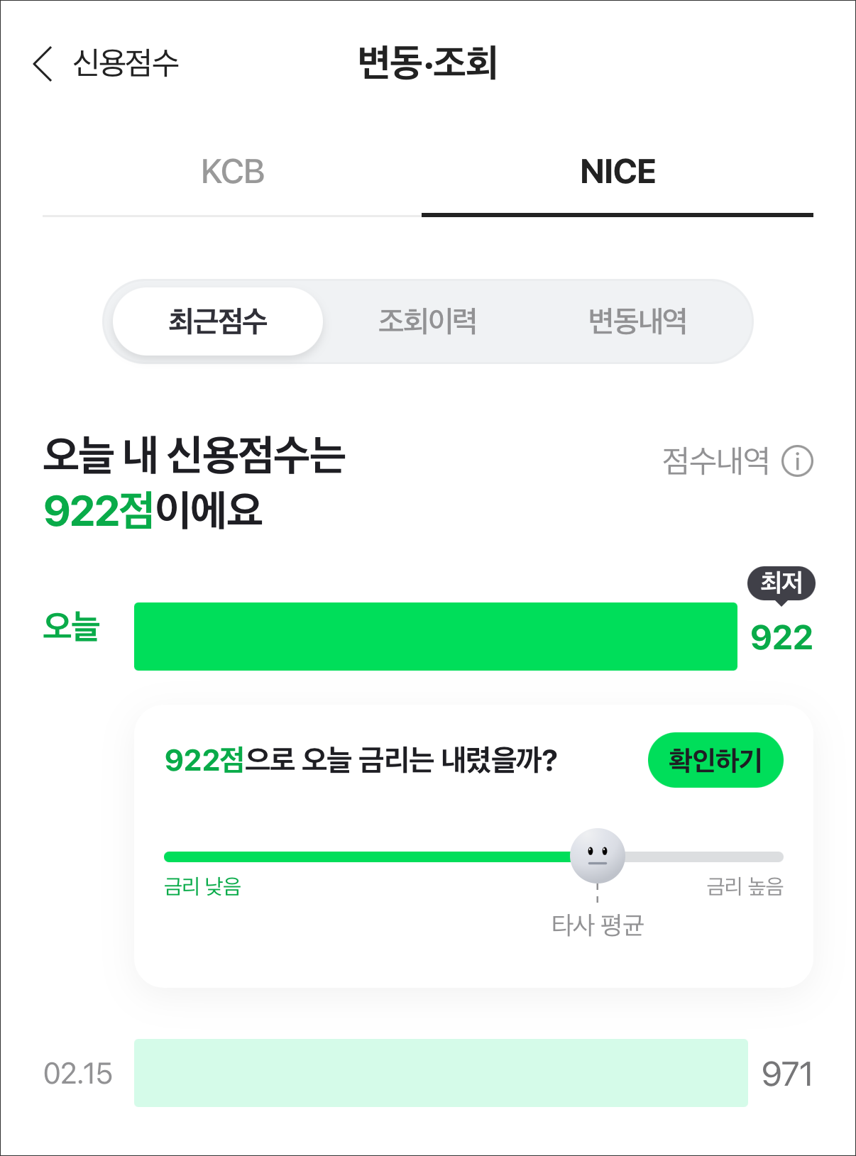 원래 971점이었는데, 1억 가까운 돈을 대출한 후에는 신용점수가 49점 정도가 떨어졌습니다. 그래서 지금은 922점이네요.