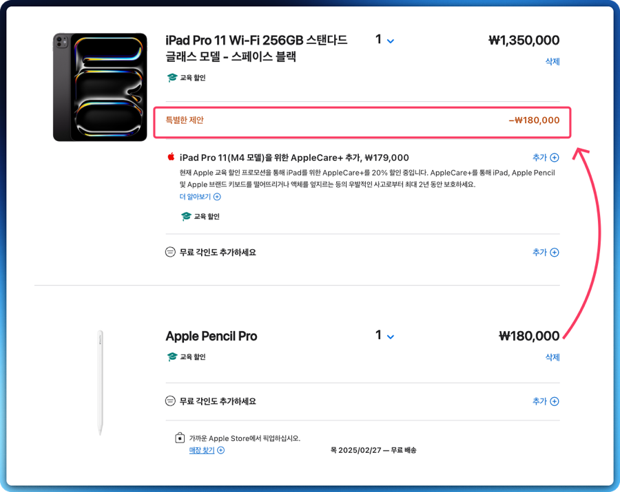 아무튼 이렇게 장바구니에 담고 결제를 할 때 보면, 특별 프모로션이 들어가서 애플펜슬 프로의 교육할인 가격만큼 -가 된 것을 알 수 있습니다. 결국 애플펜슬 프로의 가격만큼 할인을 받고 구입할 수 있다는 뜻이죠.