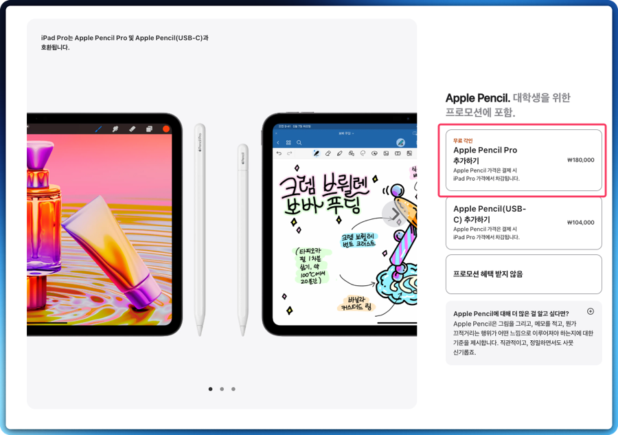 그 이유는 대학생이나 교직원이라면, 유니데이즈 인증 후 아이패드 제품을 구입할 때 애플펜슬 프로를 증정받을 수 있는 이벤트 프로모션을 하기 때문인데요.