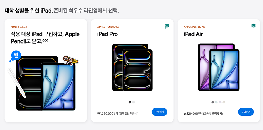올해는 2025년 3월 13일까지 애플스토어에서 교육할인 특별 프로모션이 진행됩니다. 아이패드 프로, 그리고 아이패드 에어 제품을 구입하면 그 비싼 애플펜슬 프로를 무상으로 받을 수 있죠. 사실상 학생할인 + 추가할인을 받는 것이나 마찬가지입니다.