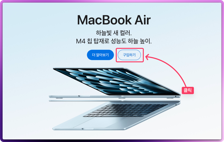 여기서 구입하기를 선택하시면 되며, 만약 이 글을 나중에 보고 계셔서 메인에 신형 맥북에어가 보이지 않는다면...