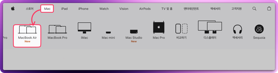 이렇게 위에 메뉴에서 'Mac'를 고르고, MacBook Air를 찾아 들어가면 됩니다. ㅎㅎ