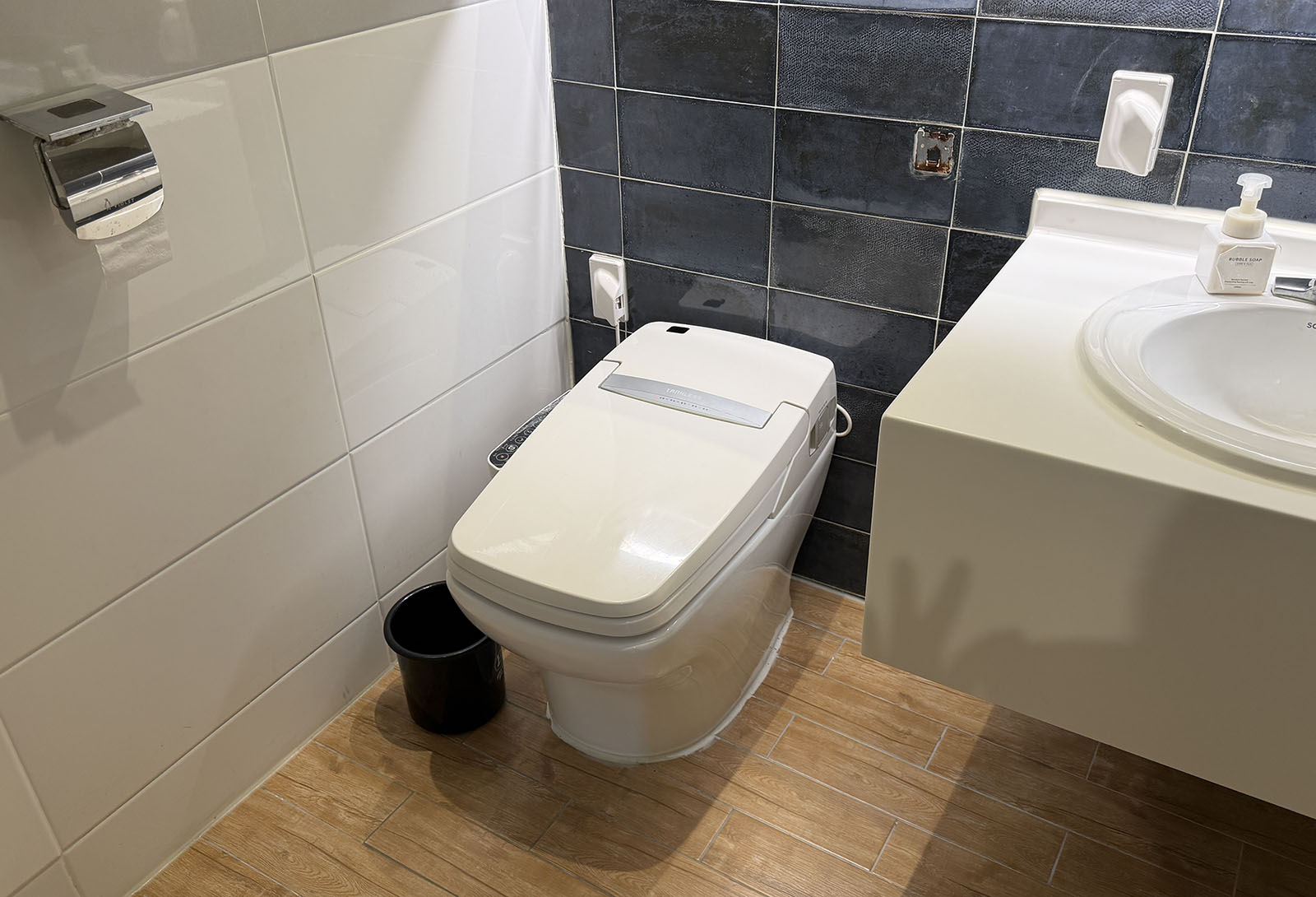 욕실도 깨끗한 편이고 바닥 타일이 목재 모양이라서 뭔가 정감이 갔어요. ㅎㅎ